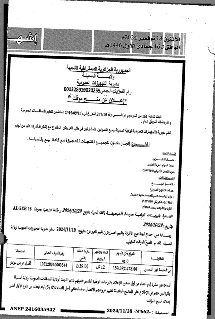 إعلان عن منح مؤقت لصفقة انجاز مخزن لتجميع المنتجات المحجوزة مع قاعة بيع بالمسيلة/ مديرية التجهيزات العمومية لولاية المسيلة