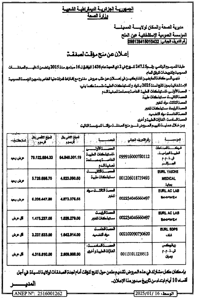 إعلان عن منح مؤقت لصفقة بتموين المؤسسة العمومية الاستشفائية بعين الملح لسنة 2025 بالمواد والمستهلكات الطبية