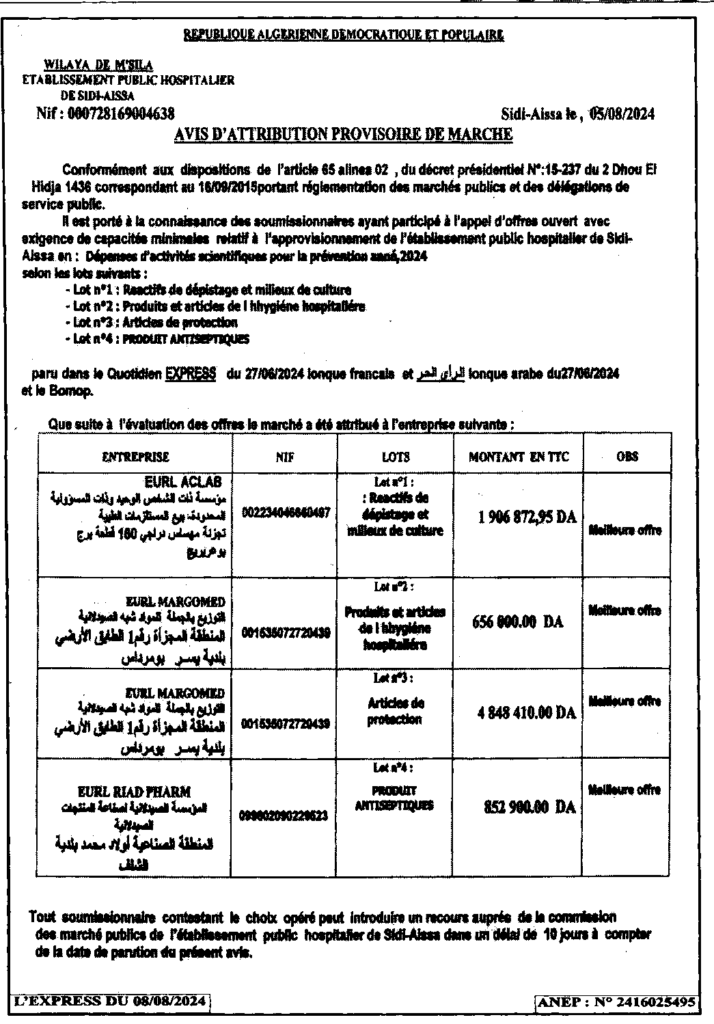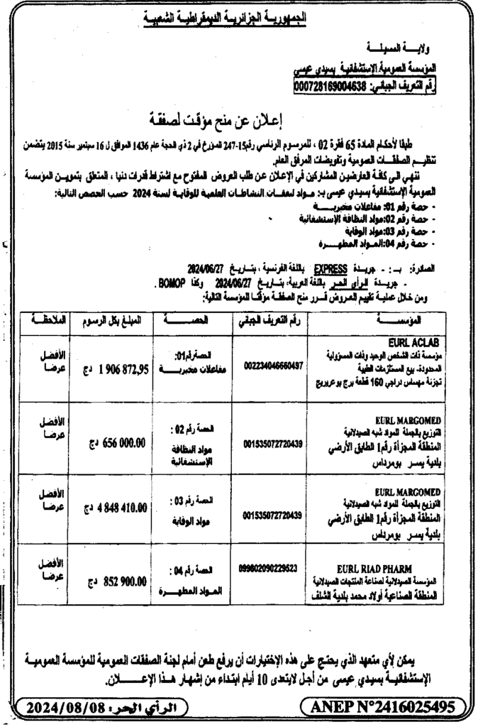 إعلان عن منح مؤقت لصفقة بتموين المؤسسة العمومية الاستشفائية بسيدي عيسى بمواد لنفقات النشاطات العلمية للوقاية لسنة 2024
