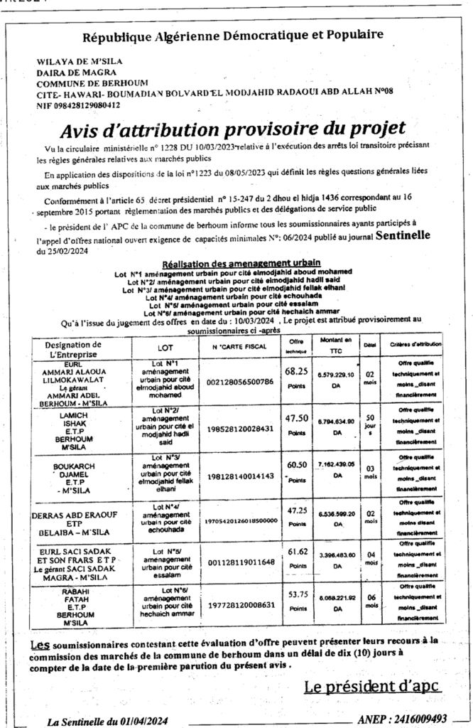 إعلان عن منح مؤقت لصفقة/ بلدية برهوم