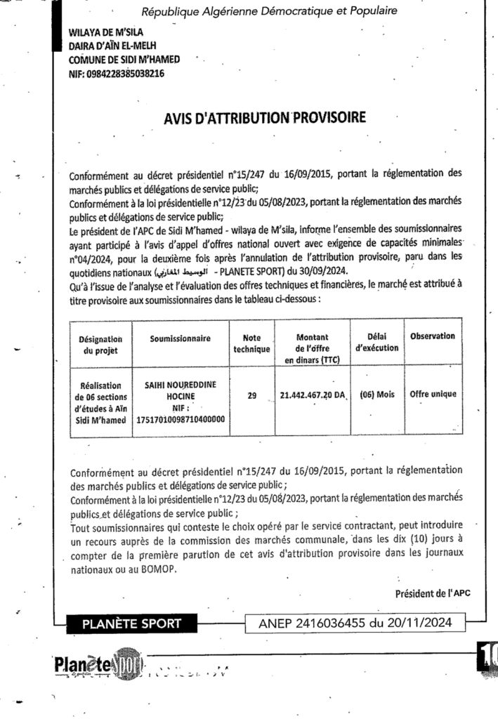 إعلان عن منح مؤقت لصفقة/ بلدية سيدي امحمد
