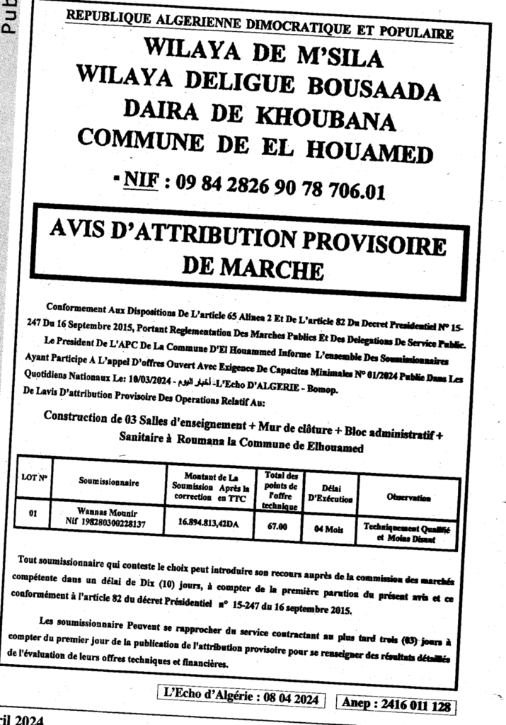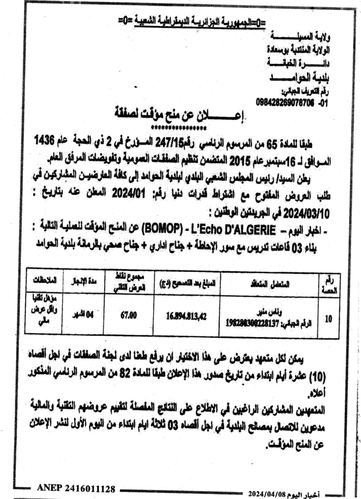 إعلان عن منح مؤقت لصفقة: بناء 03 قاعات تدريس مع سور الإحاطة/ بلدية الحوامد