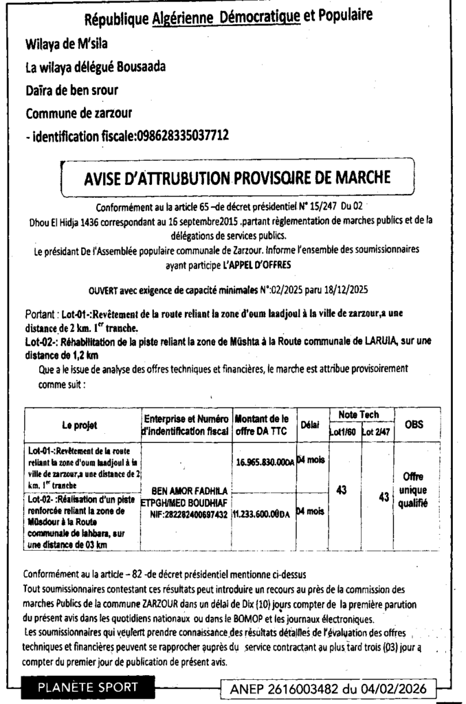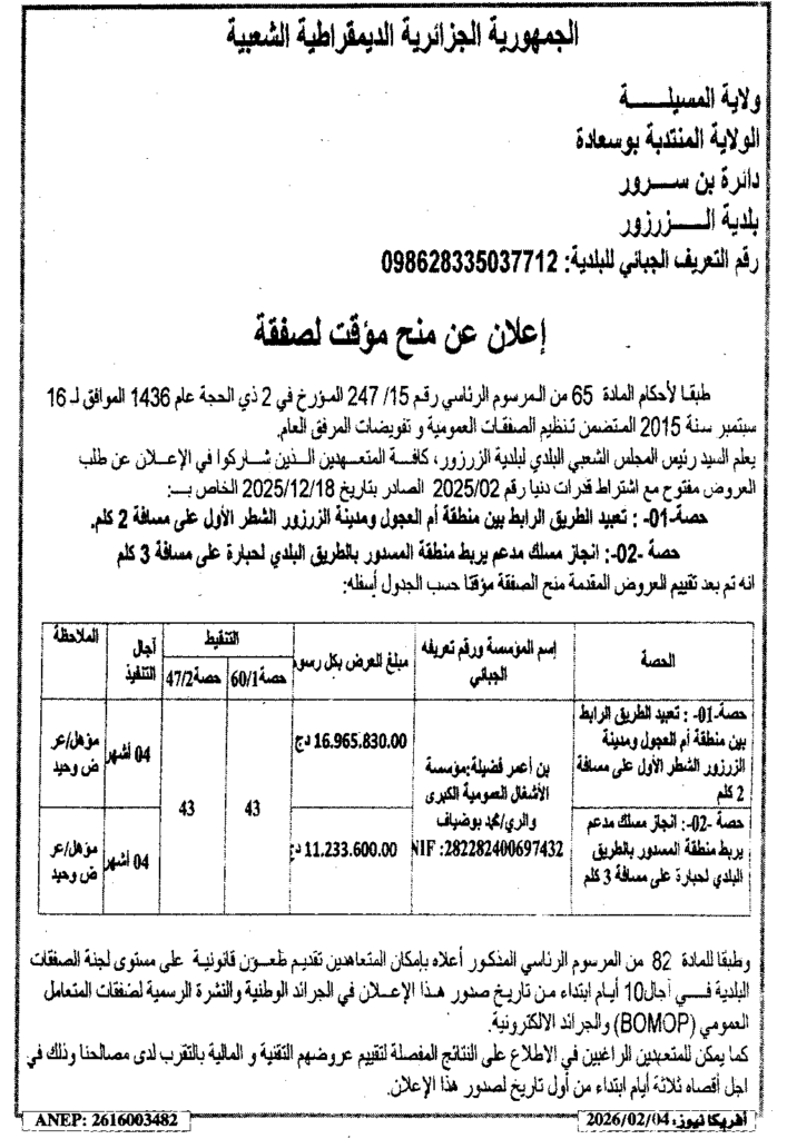 إعلان عن منح مؤقت لصفقة تعبيد الطريق/ بلدية الزرزور