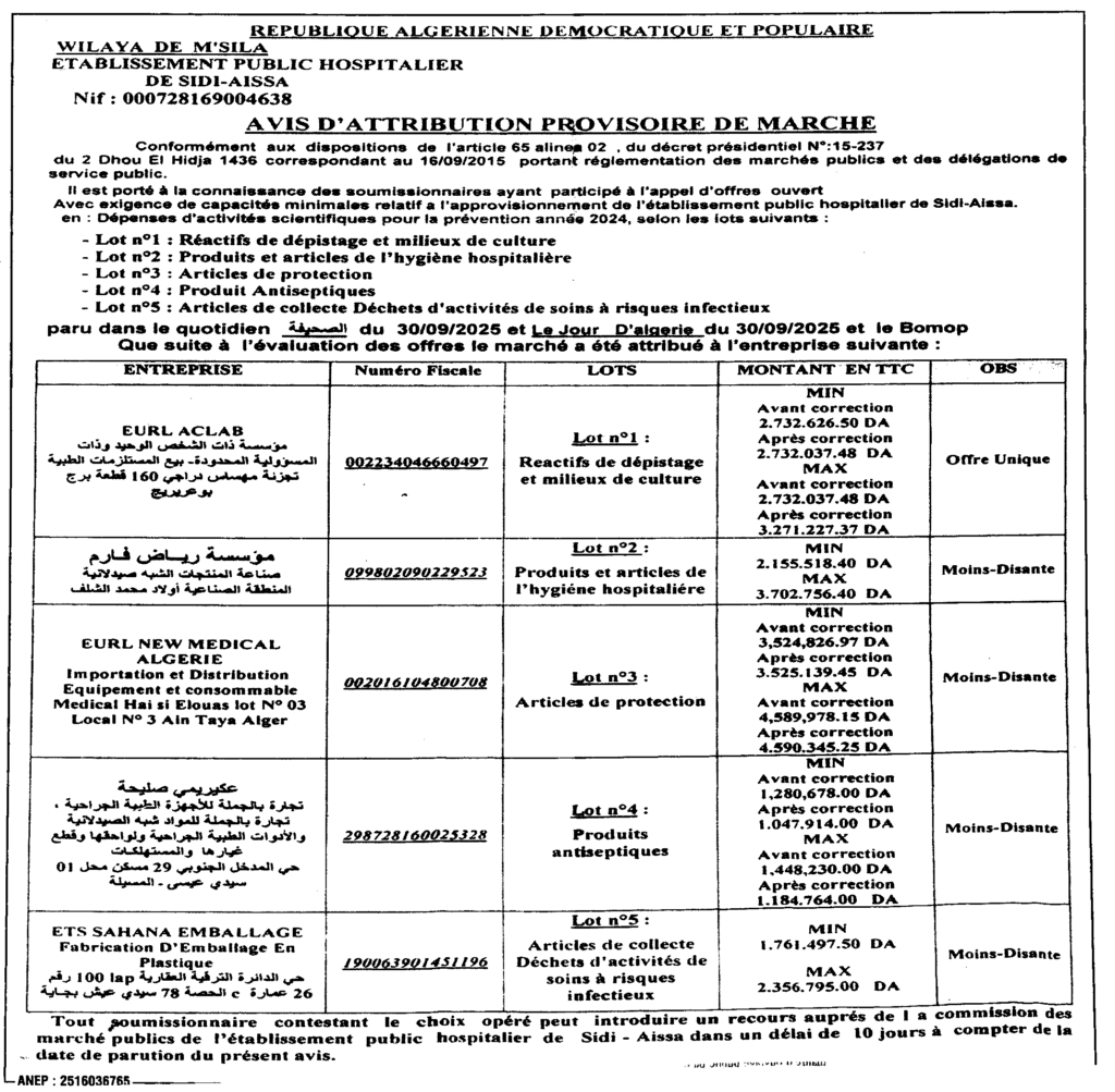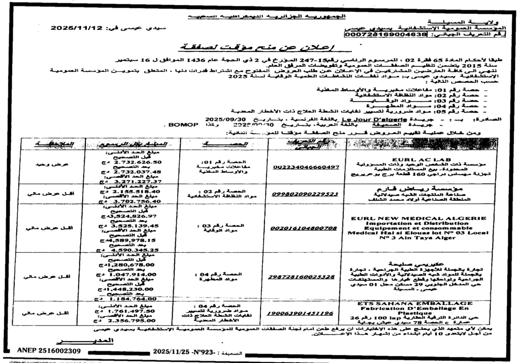 إعلان عن منح مؤقت لصفقة تموين المؤسسة العمومية الاستشفائية بسيدي عيسى بمواد نفقات النشاطات الطبية الوقاية لسنة 2025