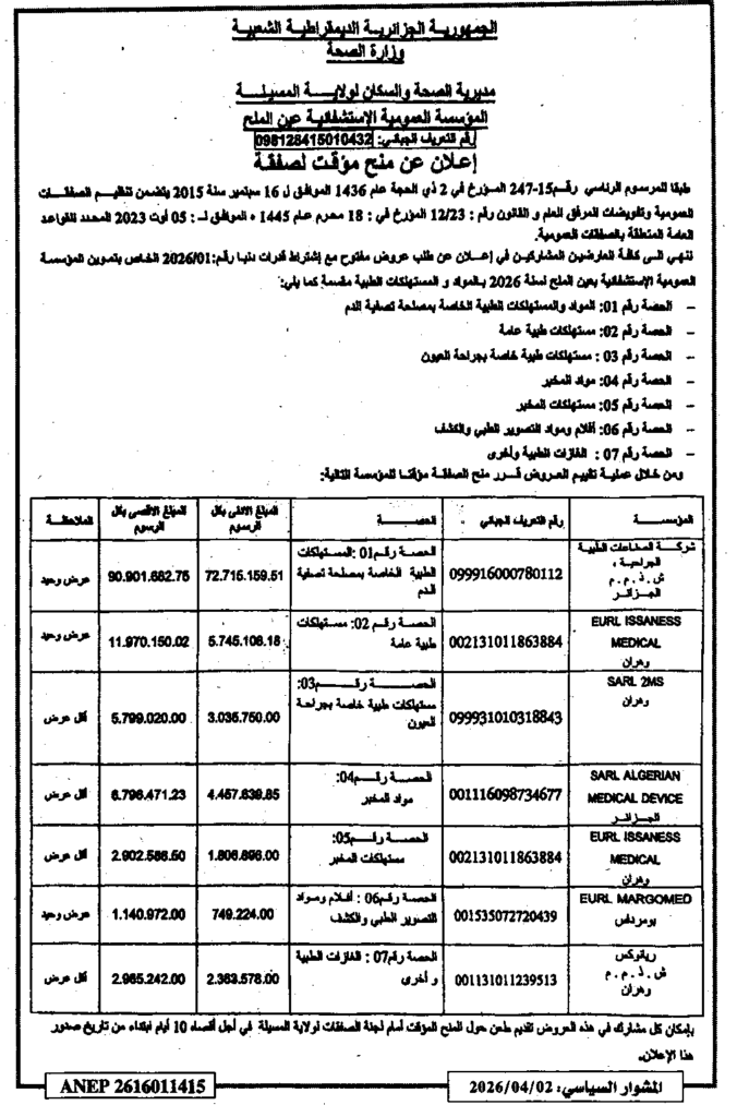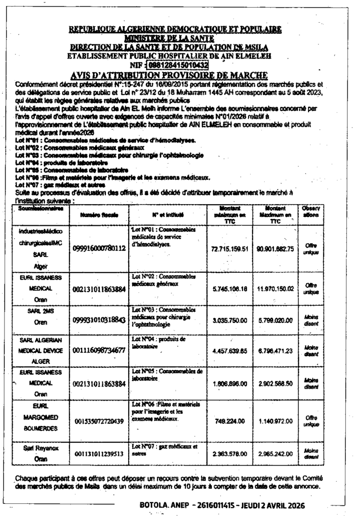 إعلان عن منح مؤقت لصفقة تموين المؤسسة العمومية الاستشفائية عين الملح لسنة 2026 بالمواد والمستهلكات الطبية