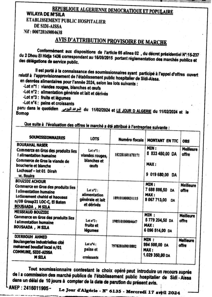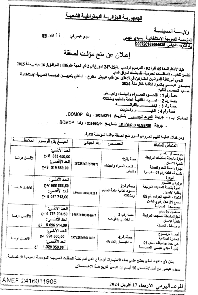 إعلان عن منح مؤقت لصفقة تموين المؤسسة العمومية الاستشفائية بسيدي عيسى بالمواد التغذية خلال سنة 2024