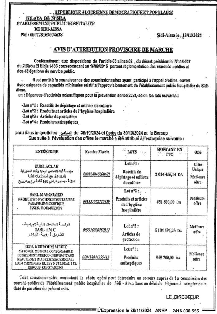 إعلان عن منح مؤقت لصفقة تموين المؤسسة العمومية الاستشفائية بسيدي عيسى بمواد نفقات النشاطات العلمية الوقاية لسنة 2024