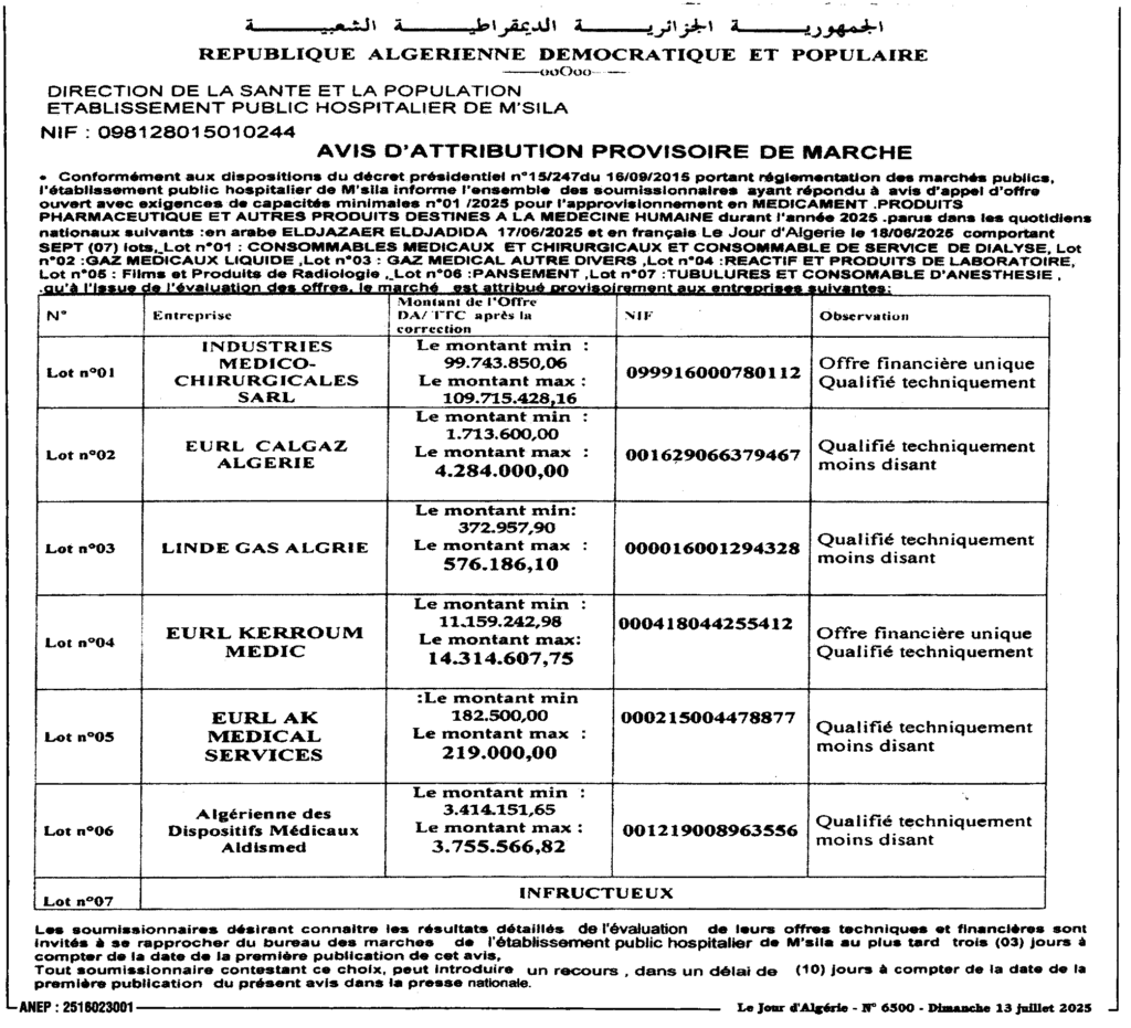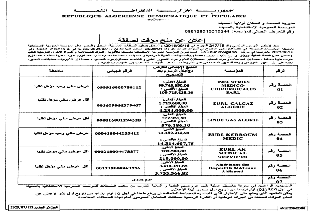 إعلان عن منح مؤقت لصفقة تموين المؤسسة العمومية الاستشفائية بالمسيلة بالأدوية المواد الصيدلانية والمواد الأخرى الموجهة للطب الإنساني خلال السنة المالية 2025