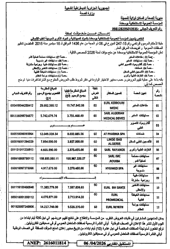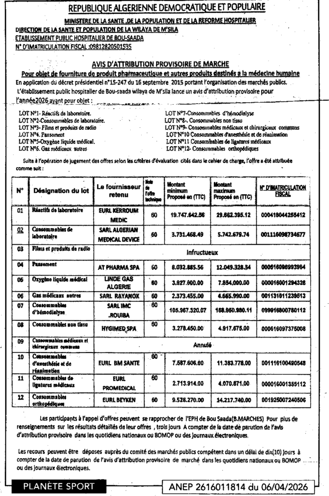 إعلان عن منح مؤقت لصفقة خاص بتموين المؤسسة العمومية الاستشفائية بوسعادة بالمواد لصيدلانية والمواد الأخرى الموجهة للطب الانساني