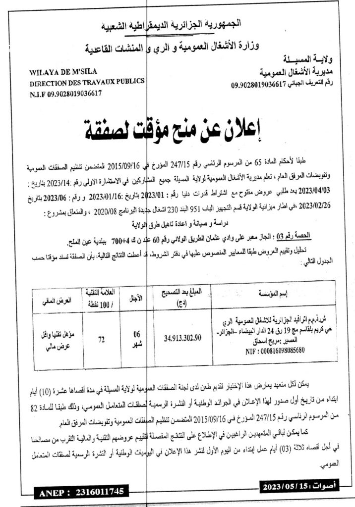 إعلان عن منح مؤقت لصفقة: دراسة وصيانة وإعادة تأهيل طرق الولاية/ مديرية الأشغال العمومية لولاية المسيلة