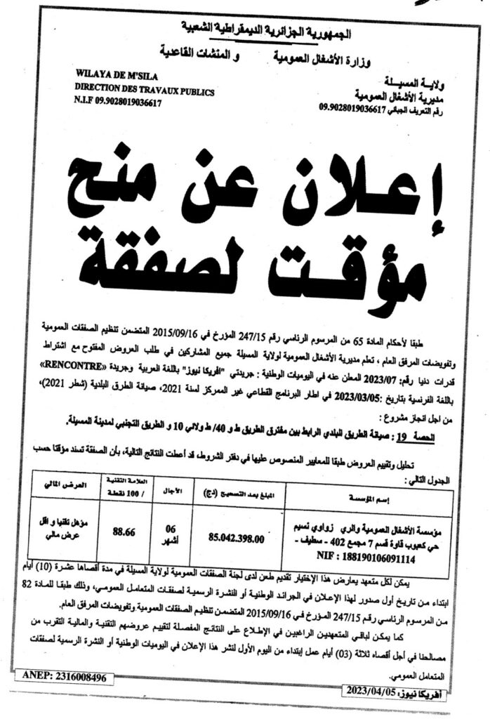 إعلان عن منح مؤقت لصفقة/ مديرية الأشغال العمومية لولاية المسيلة