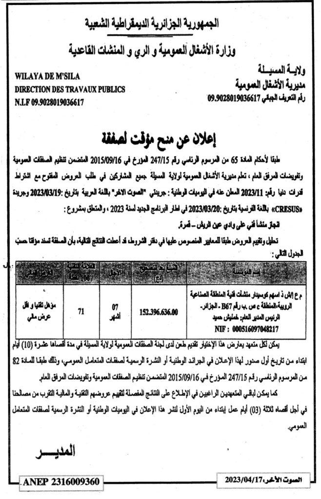 إعلان عن منح مؤقت لصفقة/ مديرية الأشغال العمومية ولاية المسيلة
