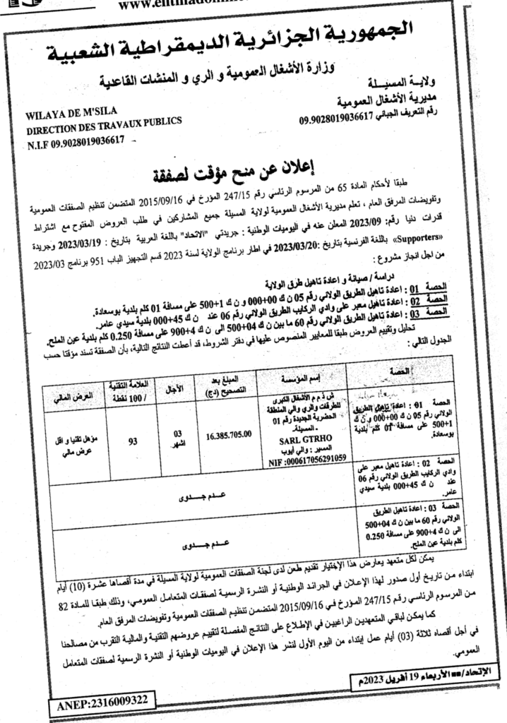 طلب عروض مفتوح مع اشتراط قدرات دنيا من اجل انجاز مشروع: دراسة وصيانة واعادة تأهيل طرق الولاية19 أبريل، 20230 22 شاركها فيسبوك X مشاركة عبر البريد طباعة
