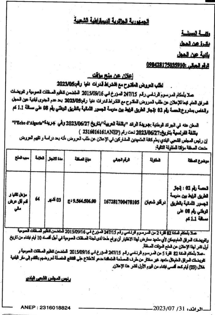 إعلان عن منح مؤقت لطلب العروض المفتوح 2023/05 بلدية عين الحجل