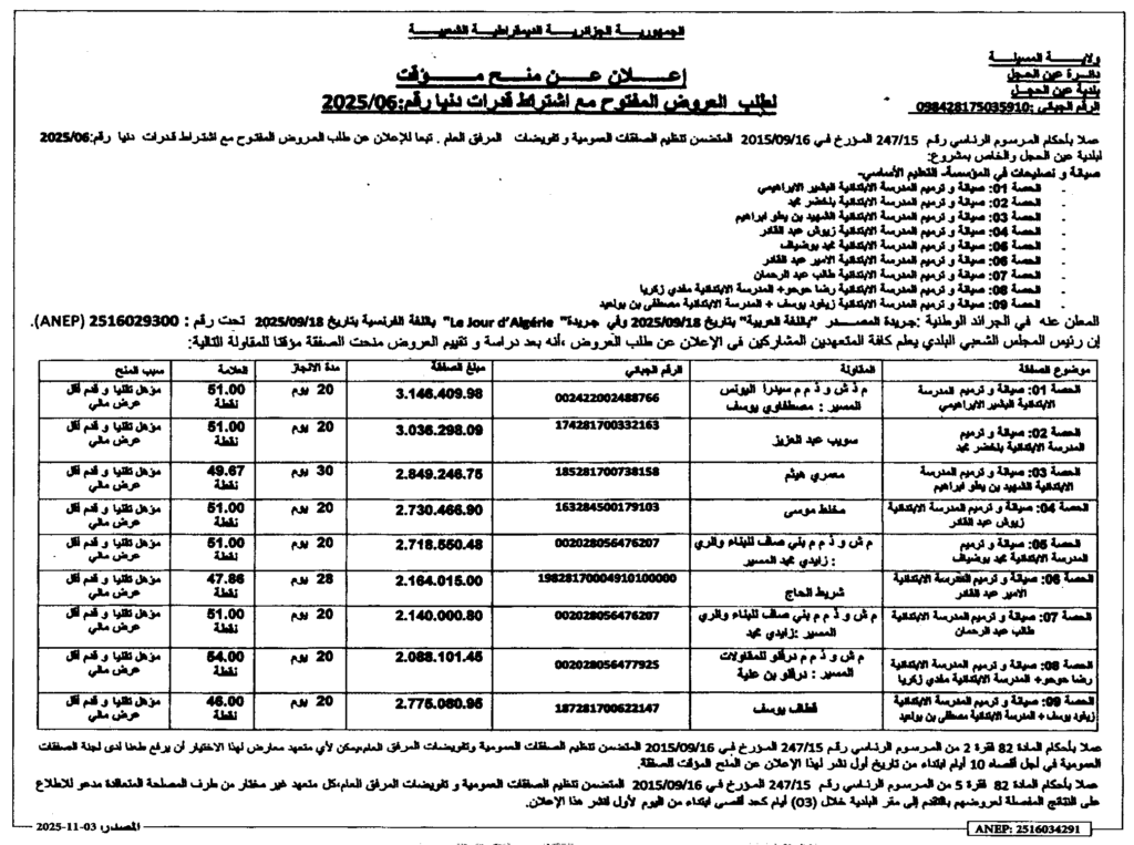 إعلان عن منح مؤقت لطلب العروض المفتوح 2025/06 بلدية عين الحجل
