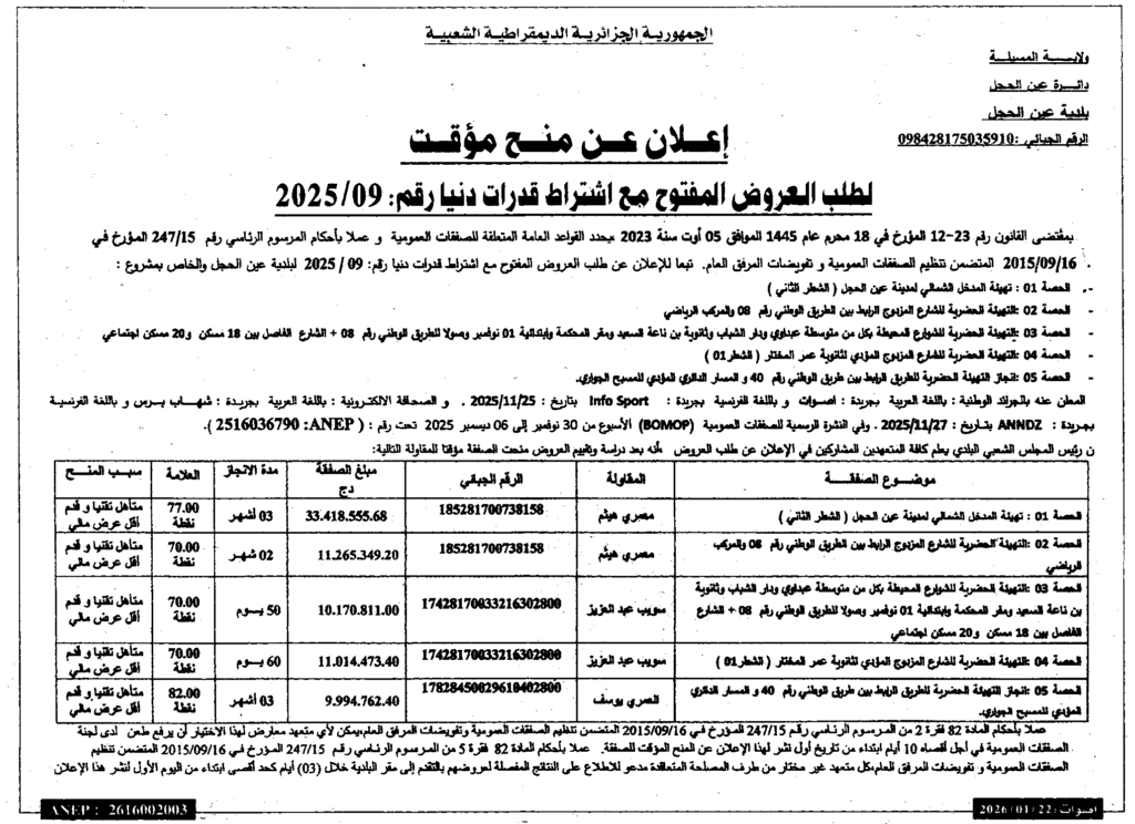 إعلان عن منح مؤقت لطلب العروض المفتوح 2025/09 بلدية عين الحجل