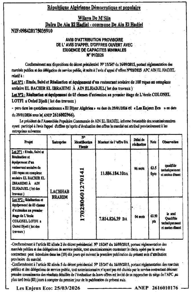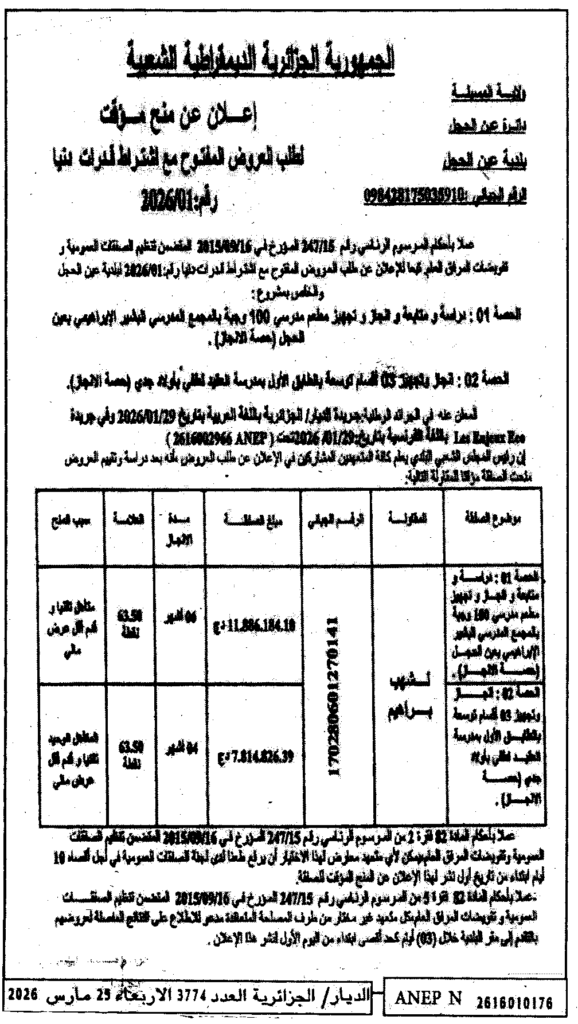 إعلان عن منح مؤقت لطلب العروض المفتوح 2026/01 بلدية عين الحجل