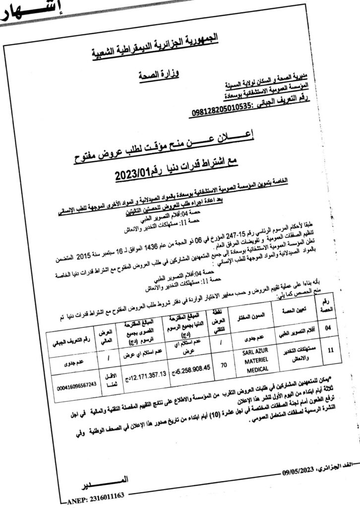 إعلان عن منح مؤقت لطلب عروض مفتوح 2023/01 الخاصة بتموين المؤسسة العمومية الاستشفائية ببوسعادة بالمواد الصيدلانية والمواد الأخرى الموجهة للطب الإنساني بعد إعادة اجراء الطلب للعروض للحصتين