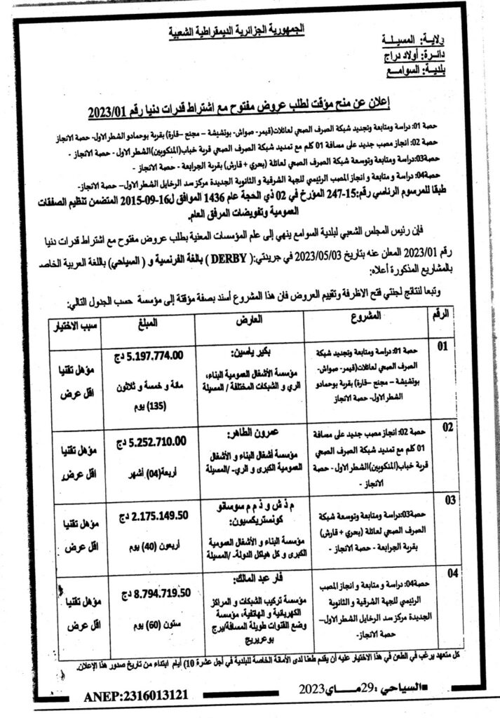 إعلان عن منح مؤقت لطلب عروض مفتوح 2023/01 بلدية السوامع