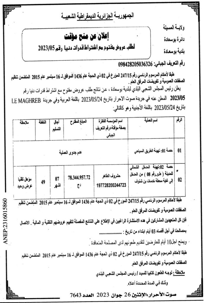إعلان عن منح مؤقت لطلب عروض مفتوح 2023/05 بلدية بوسعادة