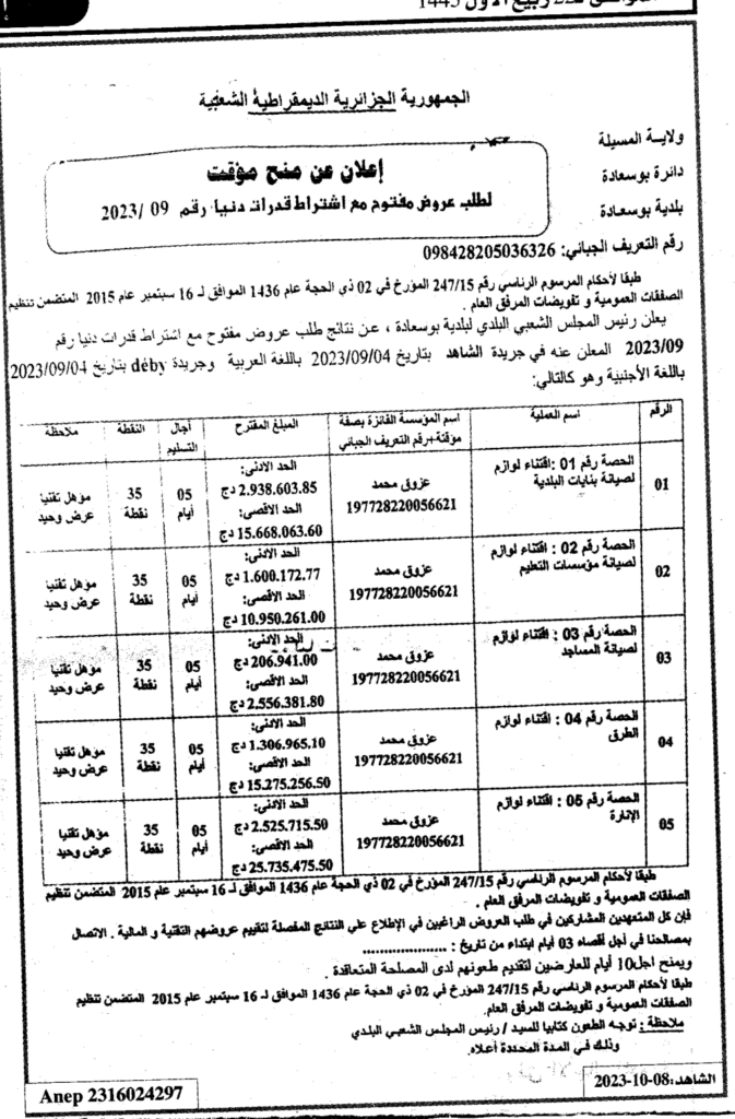 إعلان عن منح مؤقت لطلب عروض مفتوح 2023/09 بلدية بوسعادة