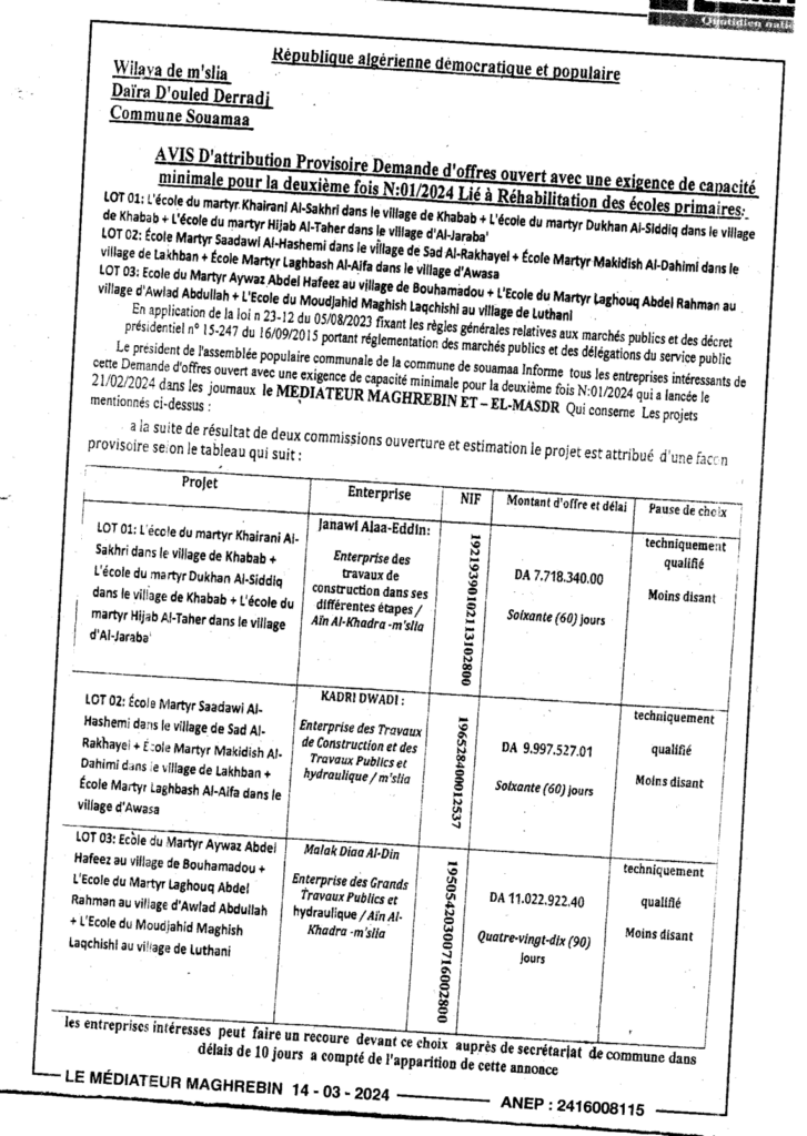 إعلان عن منح مؤقت لطلب عروض مفتوح 2024/01 للمرة الثانية متعلق بإعادة تأهيل المدارس الابتدائية/ بلدية السوامع