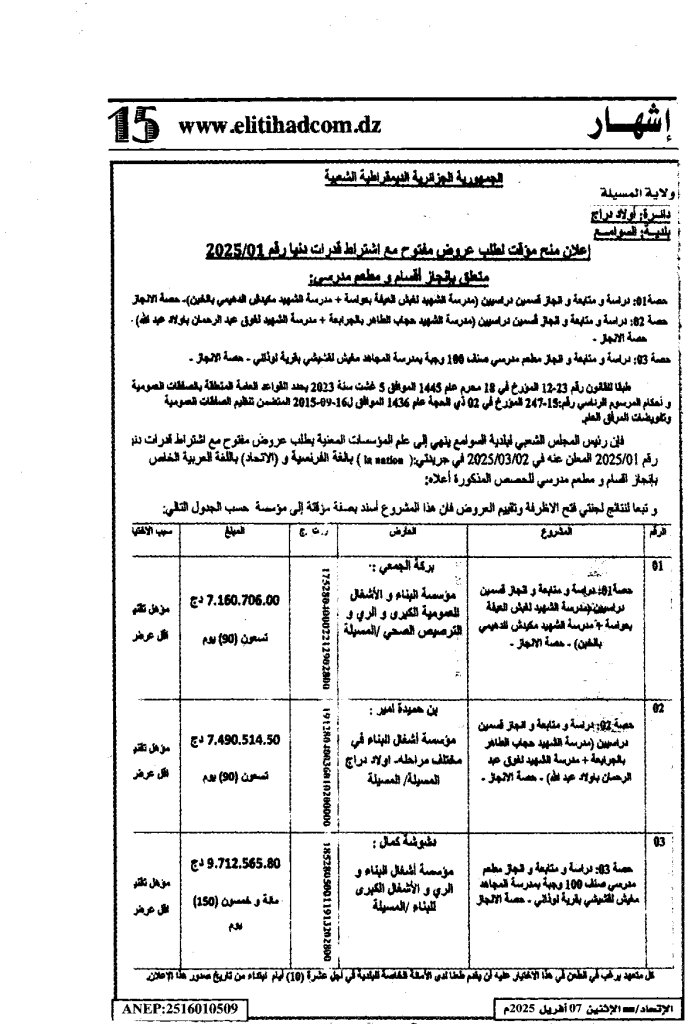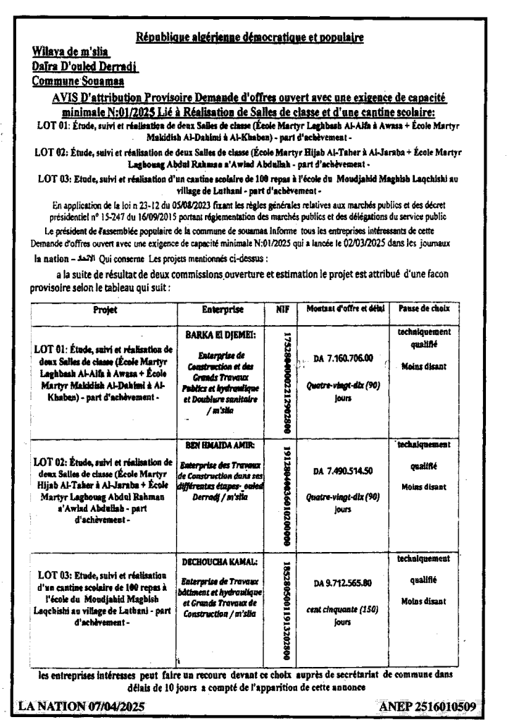 إعلان عن منح مؤقت لطلب عروض مفتوح 2025/01 متعلق بانجاز أقسام ومطعم مدرسي