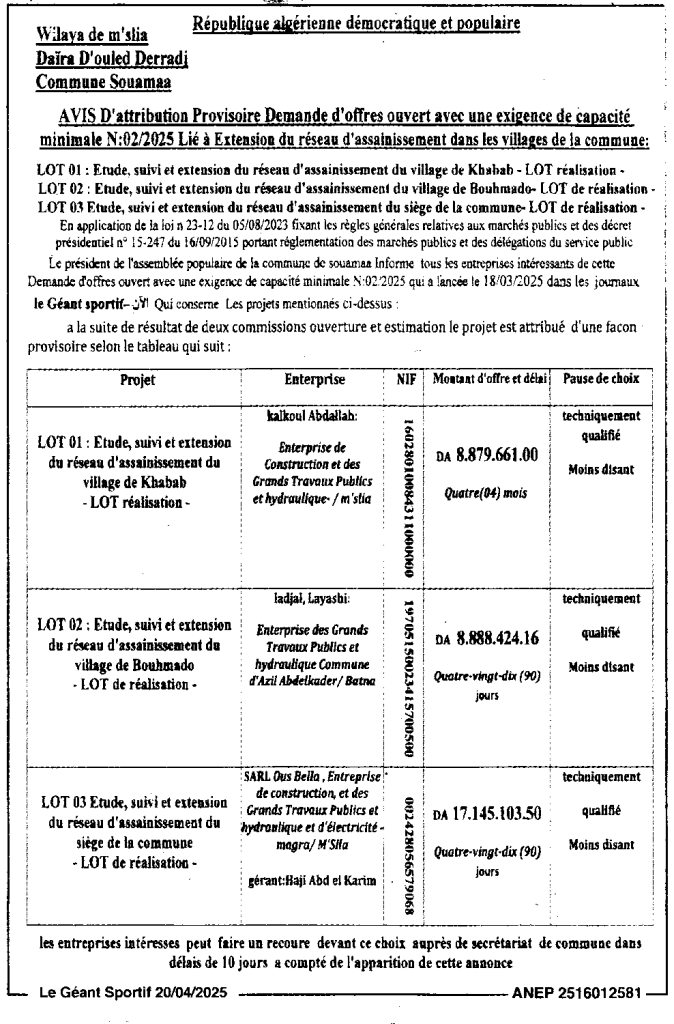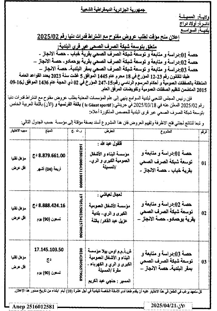 إعلان عن منح مؤقت لطلب عروض مفتوح 2025/02 متعلق بتوسعة شبكة الصرف الصحي عبر قرى بلدية السوامع