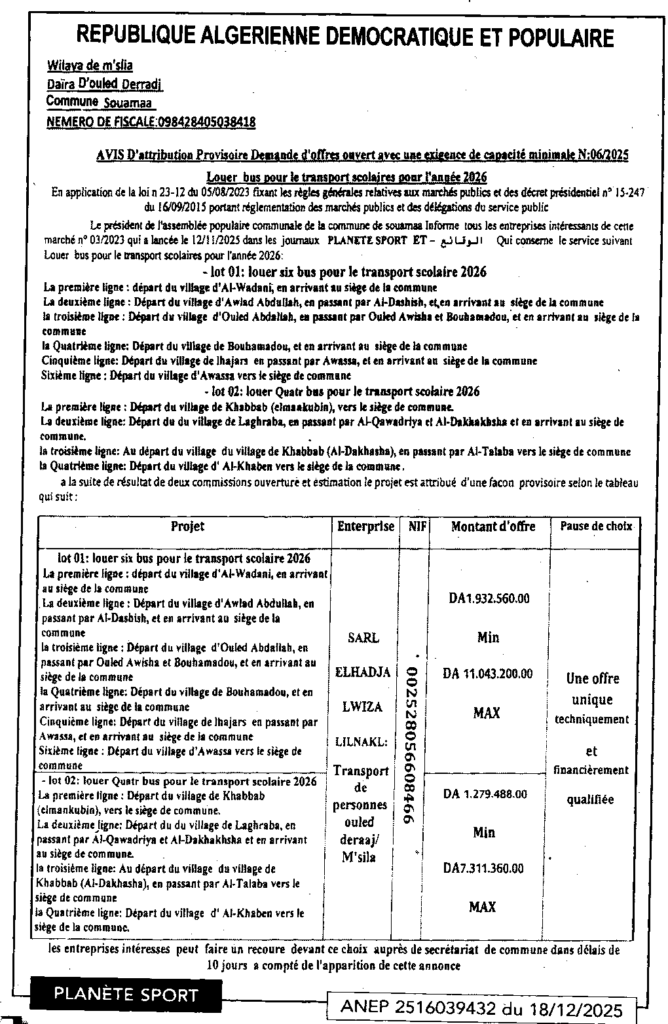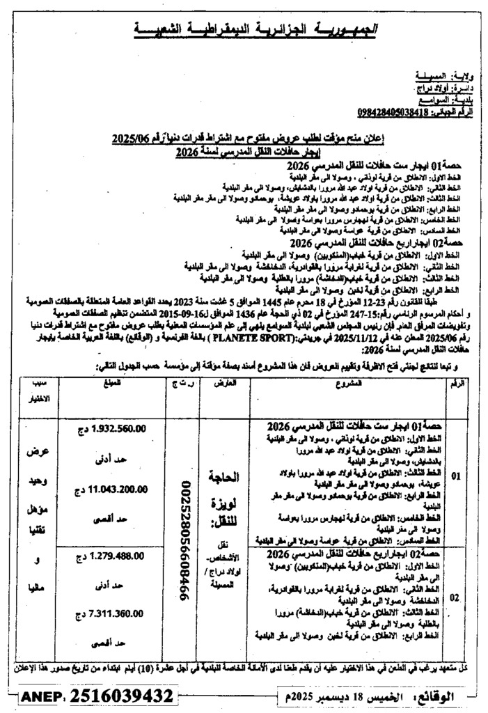 إعلان عن منح مؤقت لطلب عروض مفتوح 2025/06 بلدية السوامع