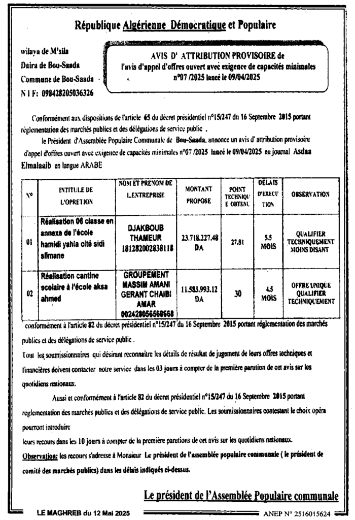إعلان عن منح مؤقت لطلب عروض مفتوح 2025/07 بلدية بوسعادة