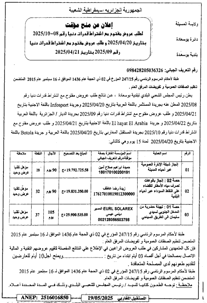 إعلان عن منح مؤقت لطلب عروض مفتوح 2025/10/09/08 بلدية بوسعادة