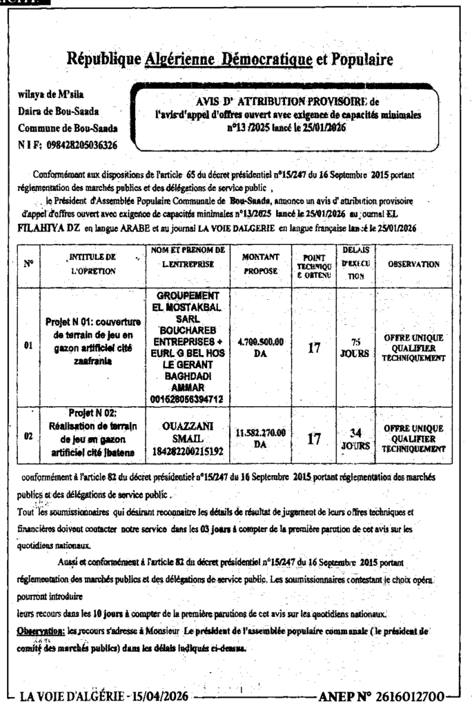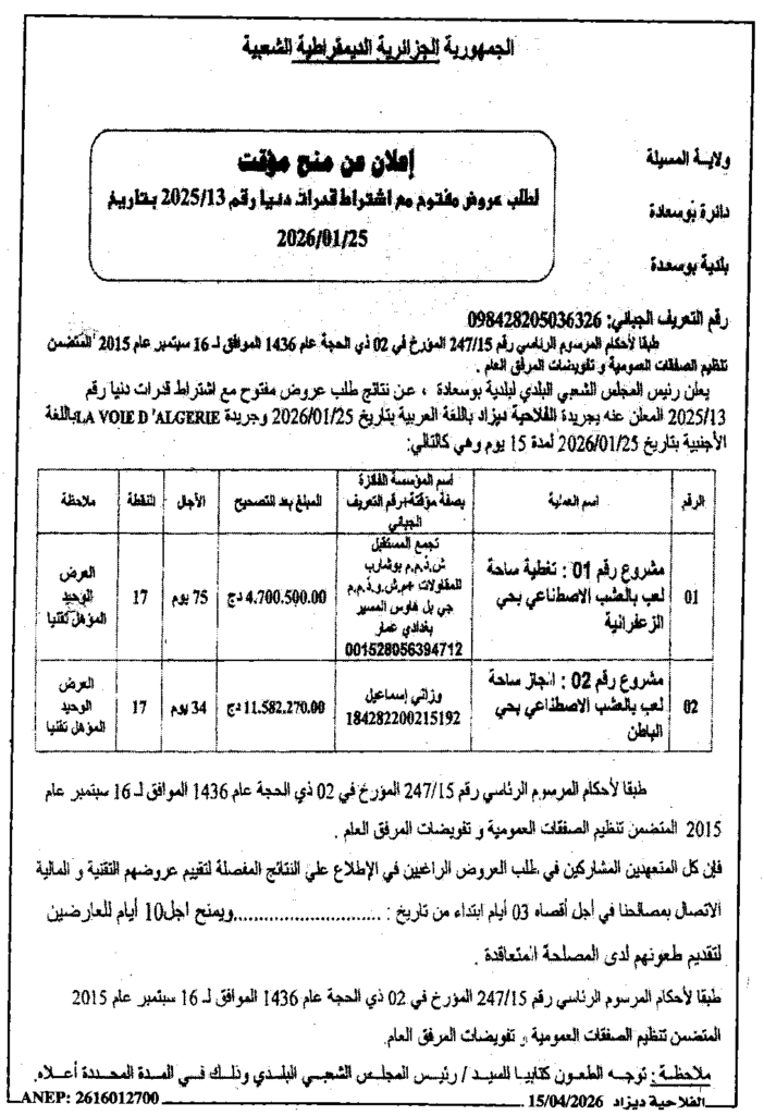 إعلان عن منح مؤقت لطلب عروض مفتوح 2025/13 بلدية بوسعادة