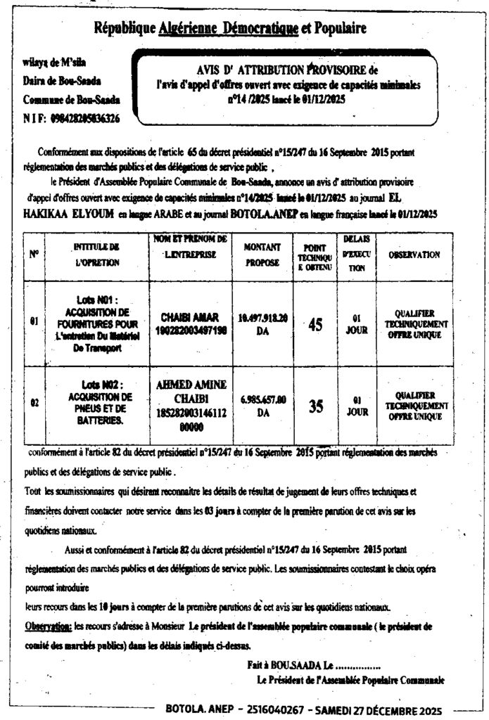 إعلان عن منح مؤقت لطلب عروض مفتوح 2025/14 بلدية بوسعادة