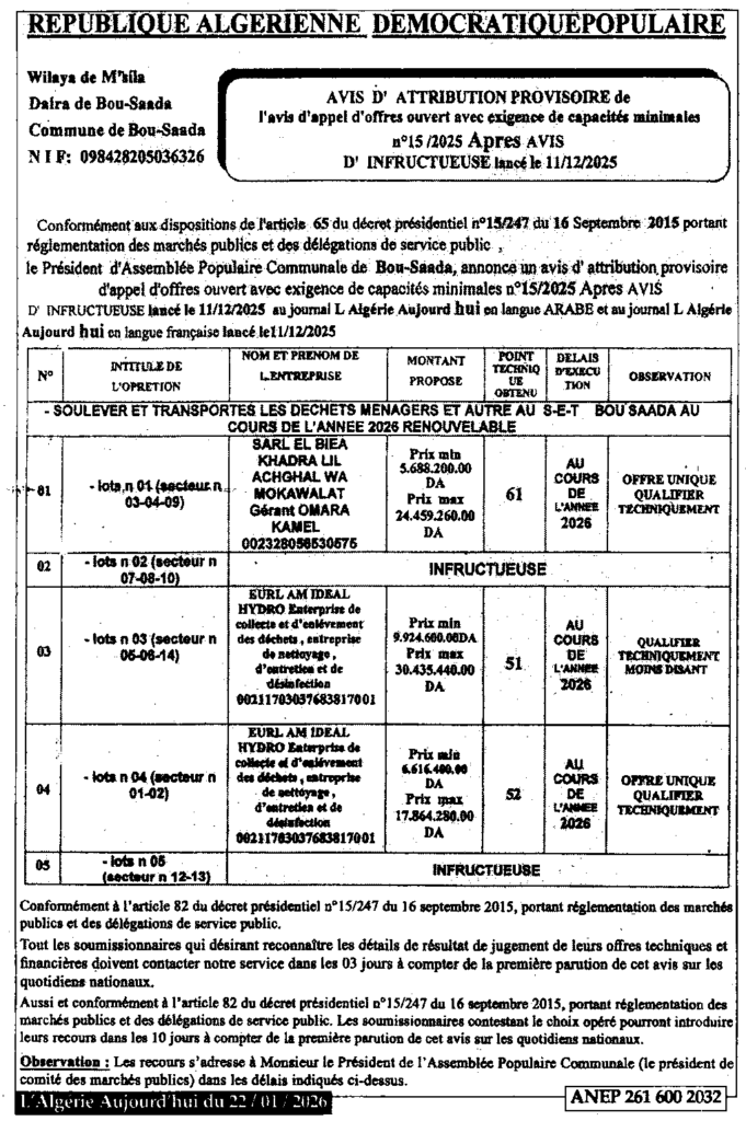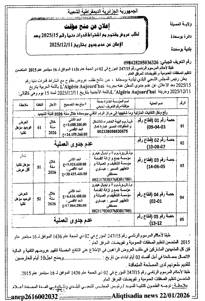 إعلان عن منح مؤقت لطلب عروض مفتوح 2025/15 بعد الاعلان عن عدم جدوى/ بلدية بوسعادة