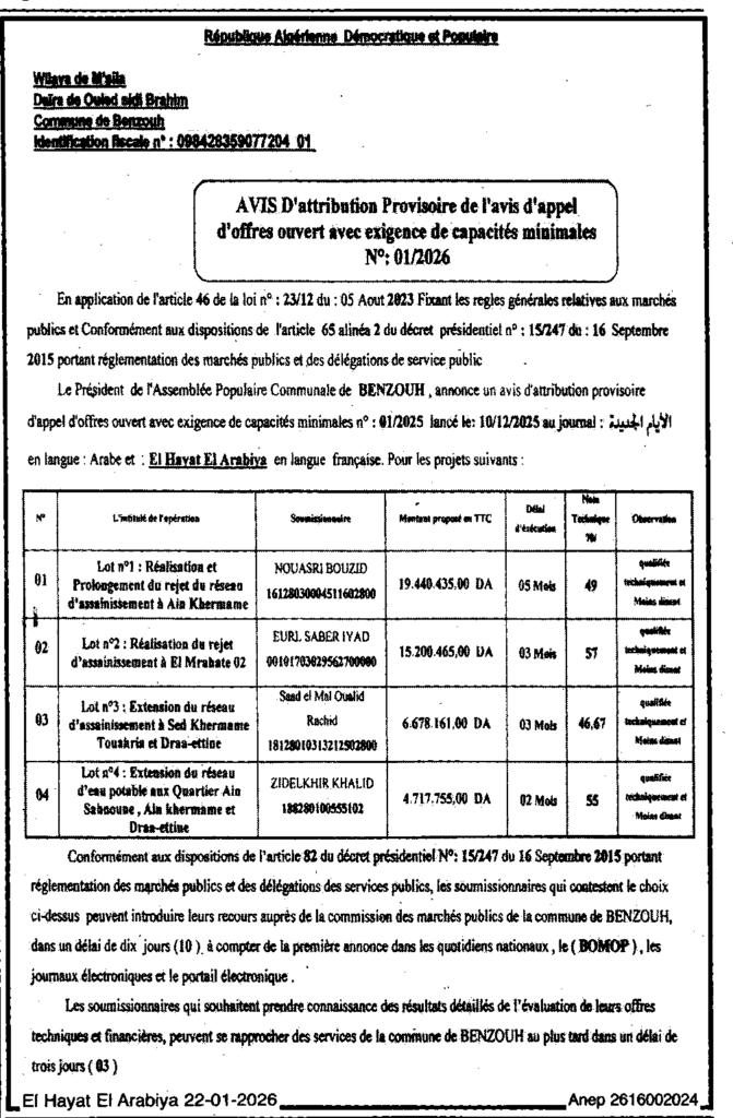 إعلان عن المنح المؤقت لطلب العروض المفتوح 2026/01 بلدية بن زوه