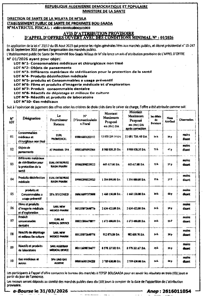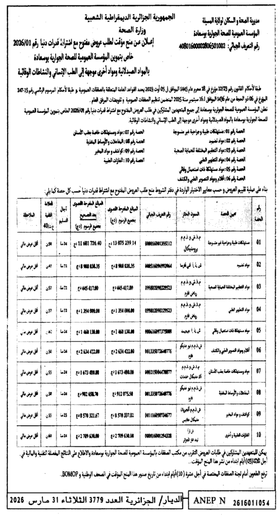 إعلان عن منح مؤقت لطلب عروض مفتوح 2026/01 خاص بتموين المؤسسة العمومية للصحة الجوارية بوسعادة بالمواد الصيدلانية ومواد اخرى موجهة إلى الكب الّغنساني والنشاطات الوقائية