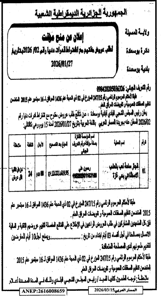 إعلان عن منح مؤقت لطلب عروض مفتوح 2026/02 بلدية بوسعادة