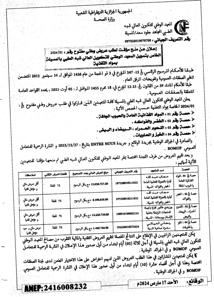 إعلان عن منح مؤقت لطلب عروض وطني مفتوح 2024/01 الخاص بتموين المعهد الوطني للتكوين العالي شبه الطبي بالمسيلة بمواد التغذية