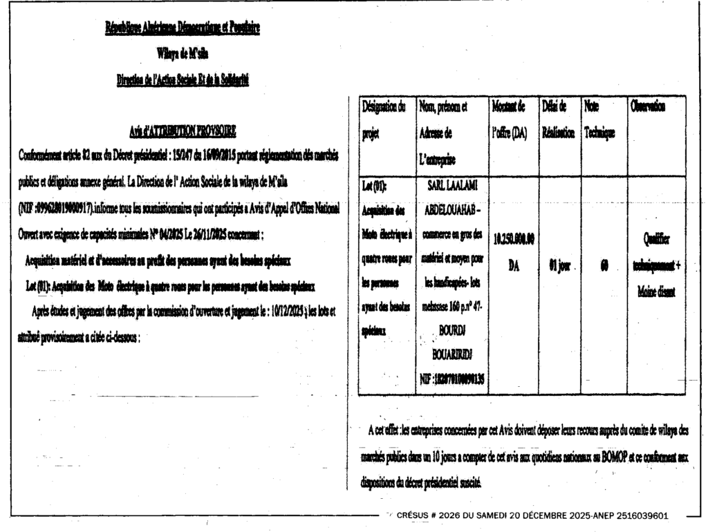 إعلان عن منح مؤقت لطلب عروض وطني مفتوح 2025/04 مديرية النشاط الاجتماعي لولاية المسيلة