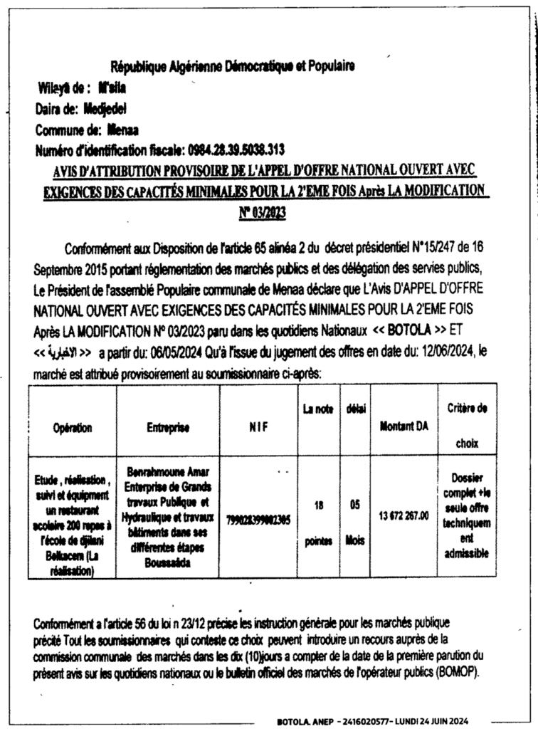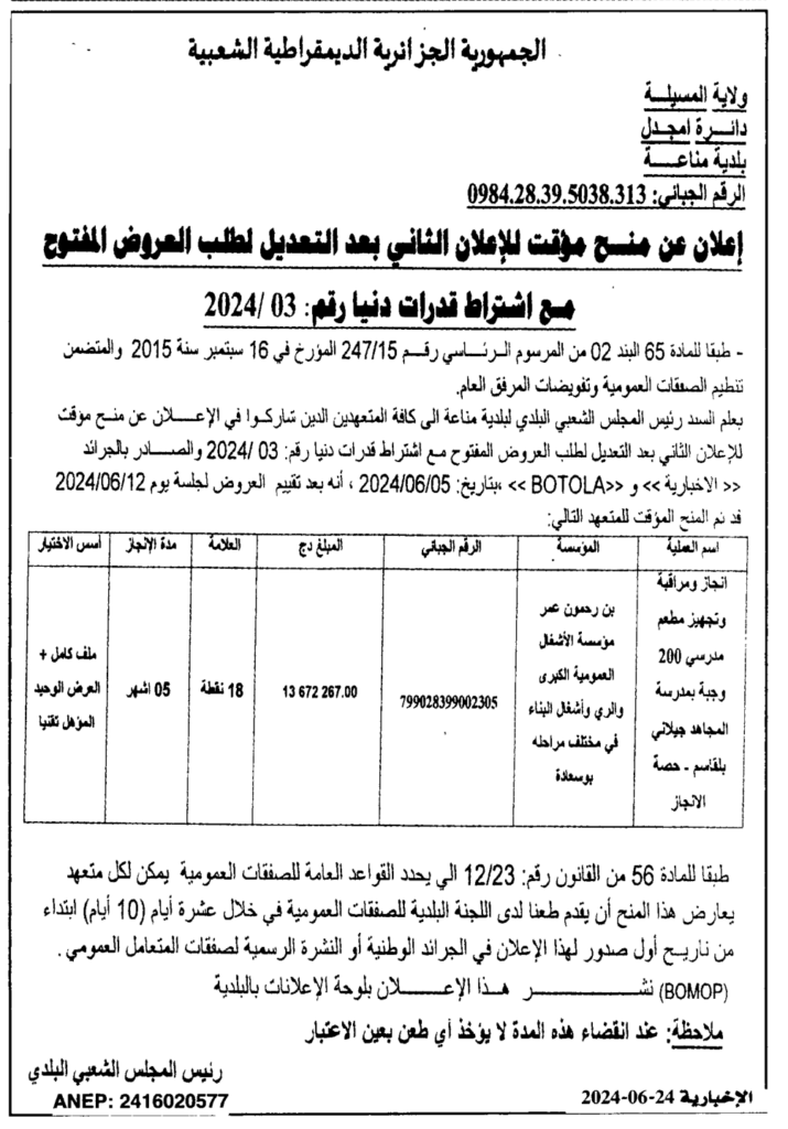 إعلان عن منح مؤقت للإعلان الثاني بعد التعديل لطلب العروض المفتوح 2024/03 بلدية مناعة
