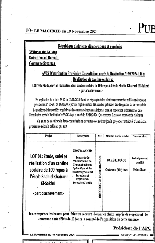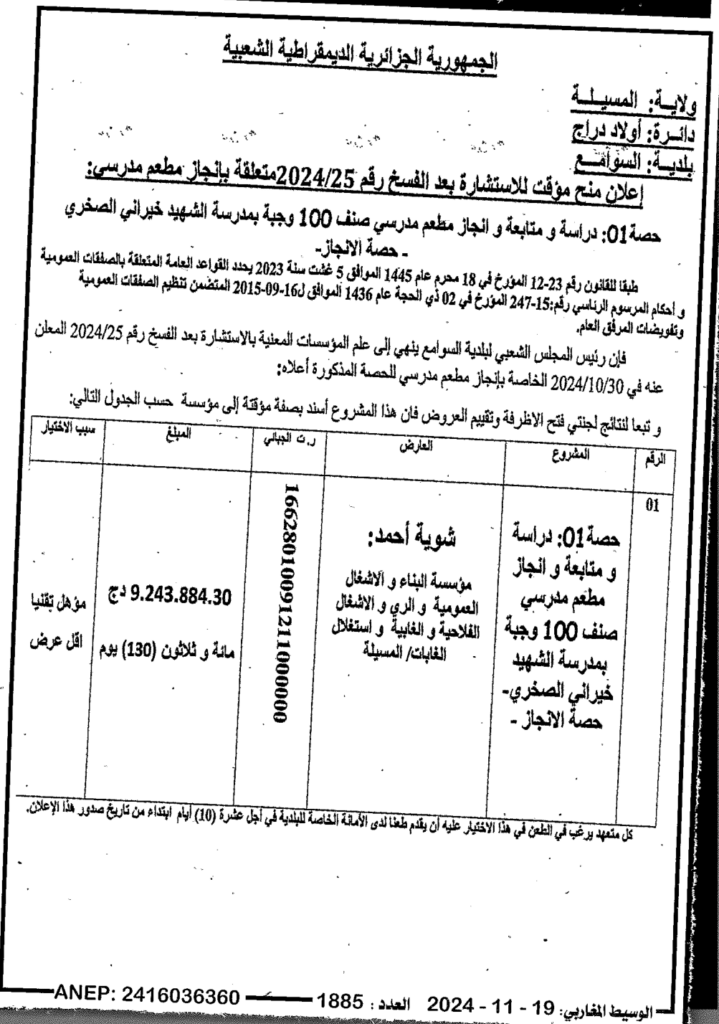 إعلان عن منح مؤقت للاستشارة بعد الفسخ 2024/25 متعلقة بانجاز مطعم مدرسي/ بلدية السوامع