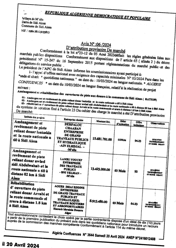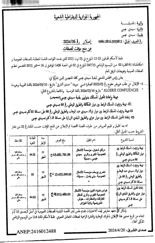 إعلان عن منح مؤقت للصفقات 2024/06 بلدية سيدي عيسى
