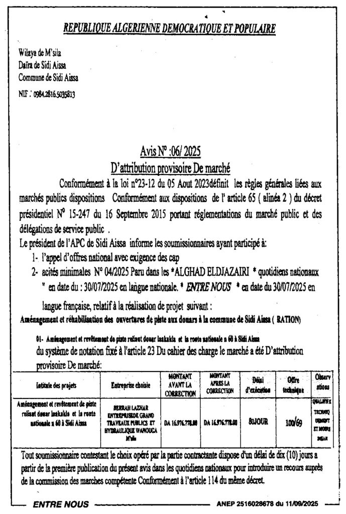 إعلان عن منح مؤقت للصفقات 2025/06 بلدية سيدي عيسى