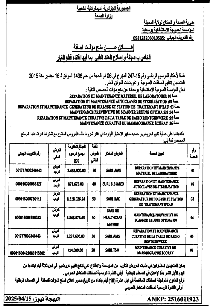 إعلان عن منح مؤقت للصفقة الخاص بصيانة وإصلاح العتاد الطبي بما فيها اقتناء قطع الغيار/ المؤسسة العمومية الاستشفائية بوسعادة