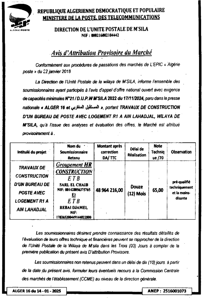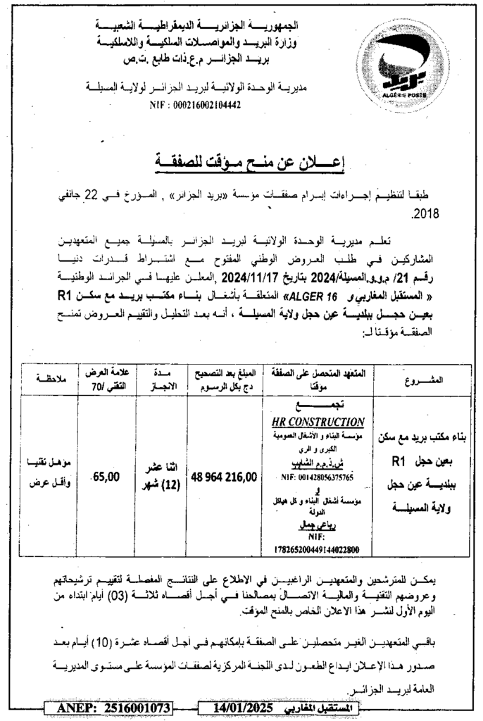 إعلان عن منح مؤقت للصفقة بناء مكتب بريد مع السكن بعين الحجل/ مديرية الوحدة الولائية لبريد الجزائر لولاية المسيلة