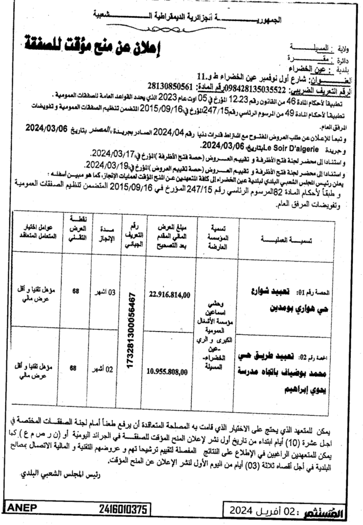 إعلان عن منح مؤقت للصفقة: تعبيد الطرق/ بلدية عين الخضراء