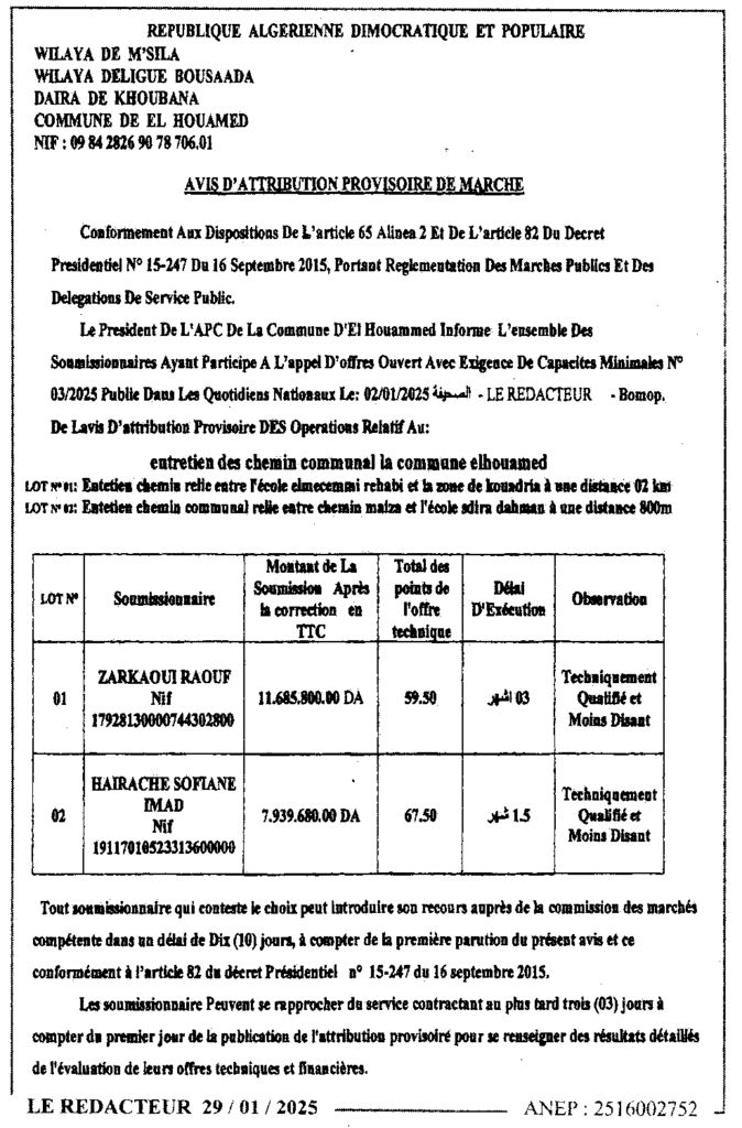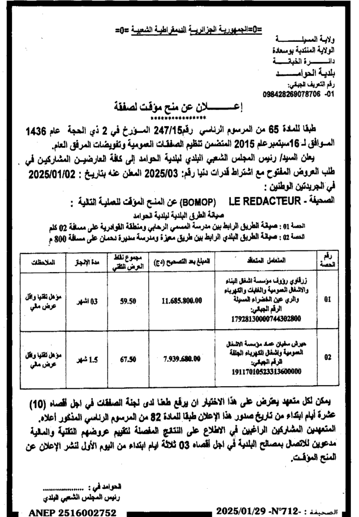 إعلان عن منح مؤقت للصفقة صيانة الطرق البلدية لبلدية الحوامد/ بلدية الحوامد