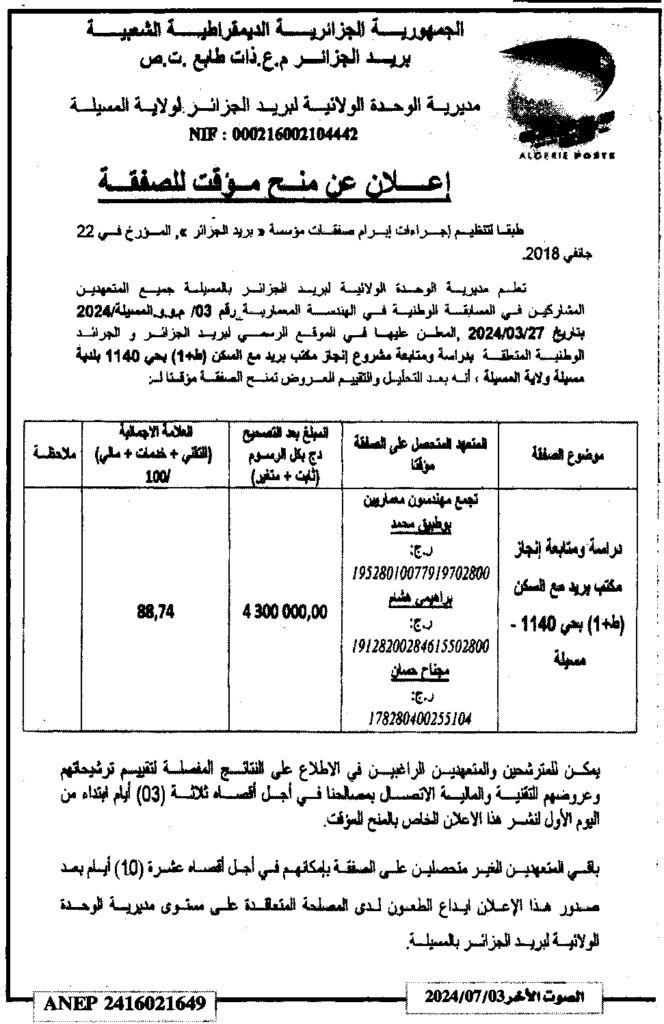إعلان عن منح مؤقت للصفقة/ مديرية الوحدة الولائية لبريد الجزائر لولاية المسيلة