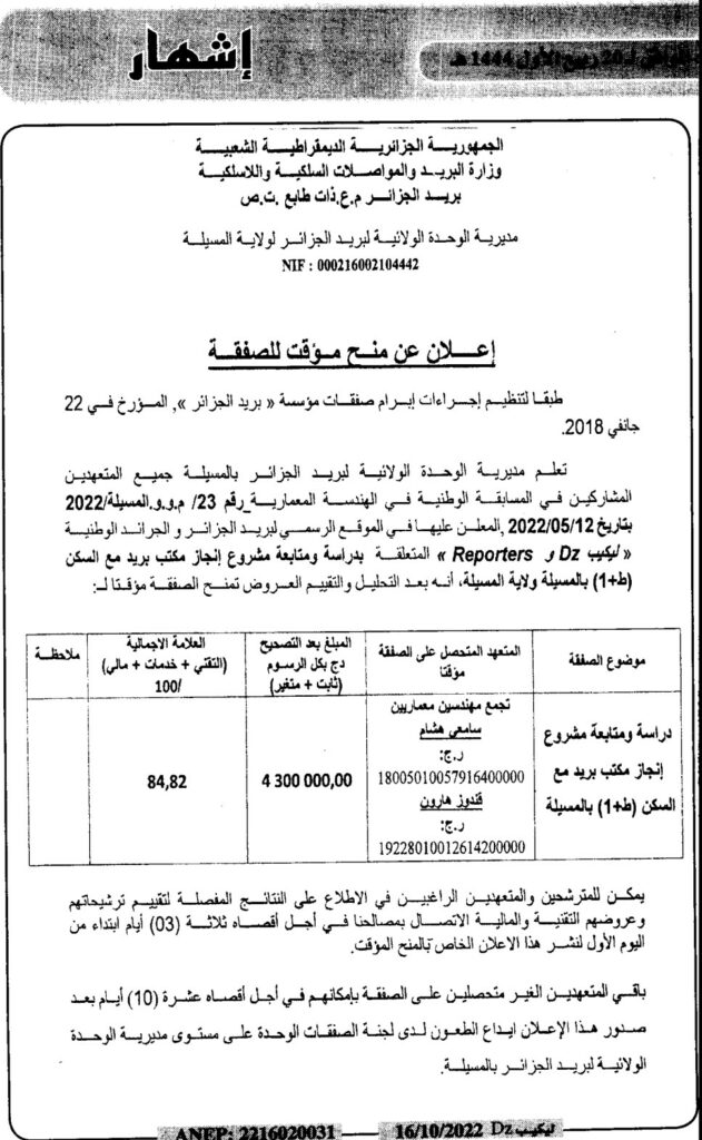منح مؤقت للصفقة المتعلقة بـ : دراسة ومتابعة مشروع إنجاز مكتب بريد مع السكن (ط+1) بالمسيلة16 أكتوبر، 20220 22 شاركها فيسبوك X مشاركة عبر البريد طباعة