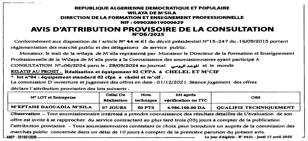 إعلان عن منح مؤقت للصفقة 2025/06 مديرية التكوين والتعليم المهنيين لولاية المسيلة